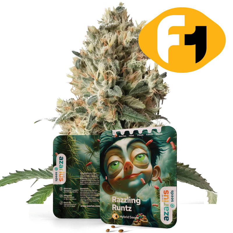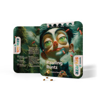 Razzling Runtz is an autoflowering F1 hybrid (Runtz x Blueberry) with 20-25% THC. This strain delivers sweet, berry flavors with tropical, earthy notes, providing uplifting, euphoric, and balanced effects. It’s easy to grow indoors or outdoors, reaching 65-85 cm, with a full cycle from germination to harvest in 70-75 days.